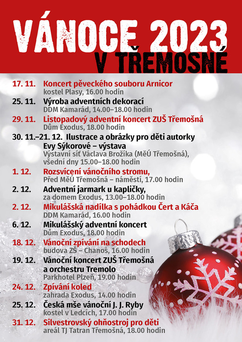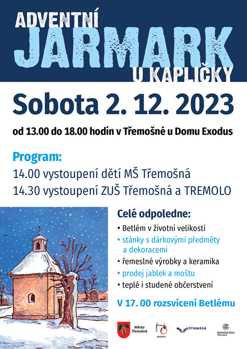 Srdečně vás zveme na letošní adventní Jarmark u kapličky, kde na vás čeká kulturní program v podání dětí z místní mateřské školy, vystoupení žáků ze ZUŠ Třemošná a kapela Tremolo.