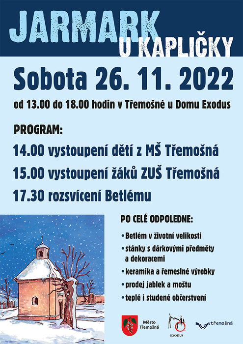 Srdečně vás zveme po dvouleté pauze na letošní Jarmark u kapličky, kde na vás čeká kulturní program v podání dětí z místní mateřské školy a vystoupení žáků ze ZUŠ Třemošná.