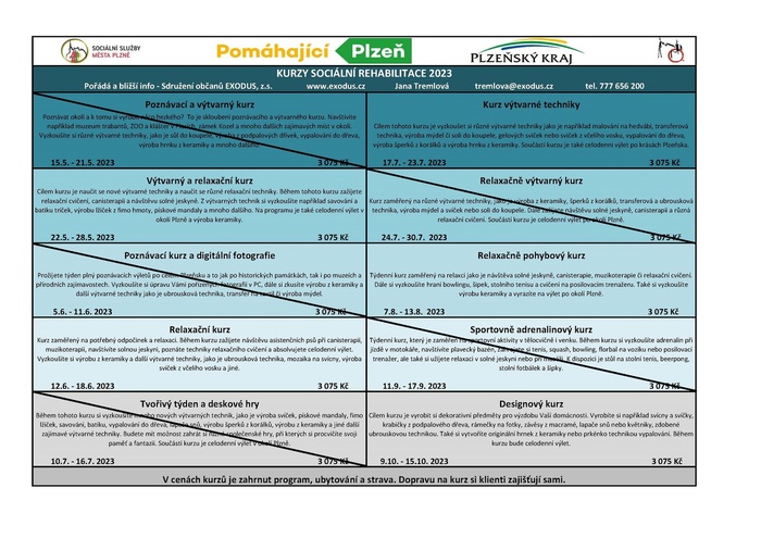 Začal nový rok 2023 a s ním bychom Vám rádi nabídli celoroční program pobytových sociálních rehabilitací určených zdravotně postiženým. Kurzy budou probíhat v bezbariérovém domě Exodus Třemošná. Ceny jednotlivých kurzů zahrnují kromě celotýdenního programu také ubytování a celodenní stravování. Po domluvě je možné zajistit osobního asistenta.